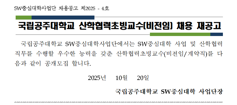 (채용) 국립공주대학교 SW중심대학사업단 산학협력초빙교수(비전임) 채용 재공고