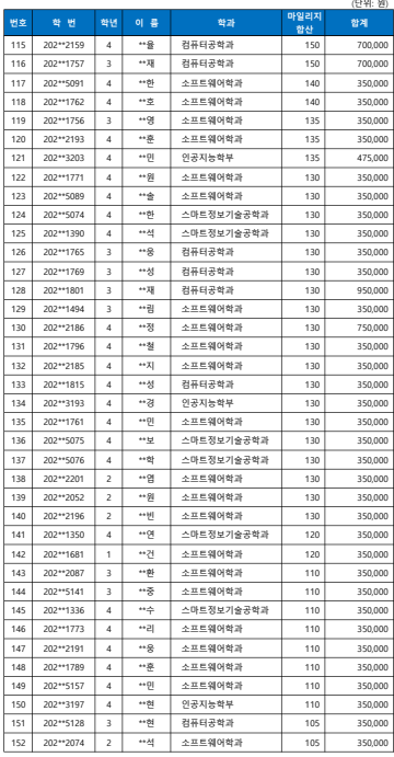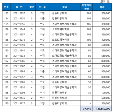 25년 2학기 SW중심대학사업 SW마일리지 장학금 지급 명단 안내 (총 170명)