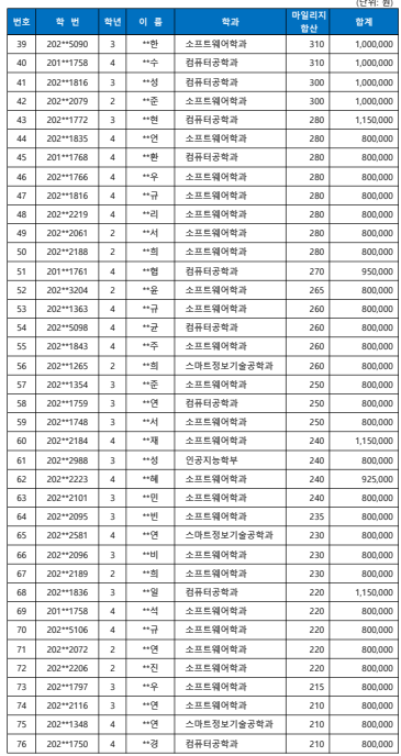 * 반영사항 : SW마일리지 적립 순위에 따른 차등 지급 반영 (장학금 내에는 캡스톤디자인, 산학협력프로젝트 금액포함된 금액임)