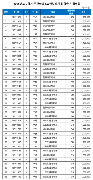 25년 2학기 SW중심대학사업 SW마일리지 장학금 지급 명단을 첨부와 같이 안내합니다.