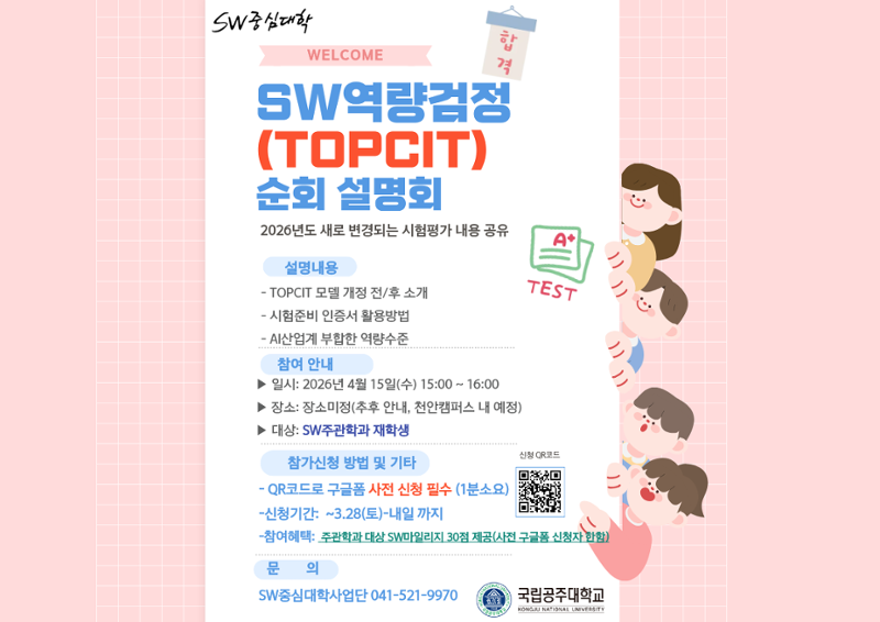 SW중심대학 사업단에서 2026년도 부터 SW역량검정(TOPCIT) 이 새로 변경되는 내용이 있어 순회설명회를 진행하고자 하오니 관심있는 학생은 신청바랍니다.